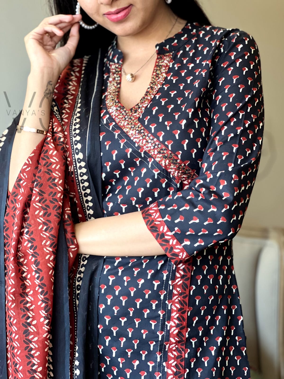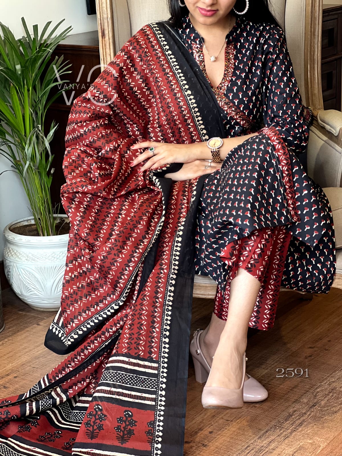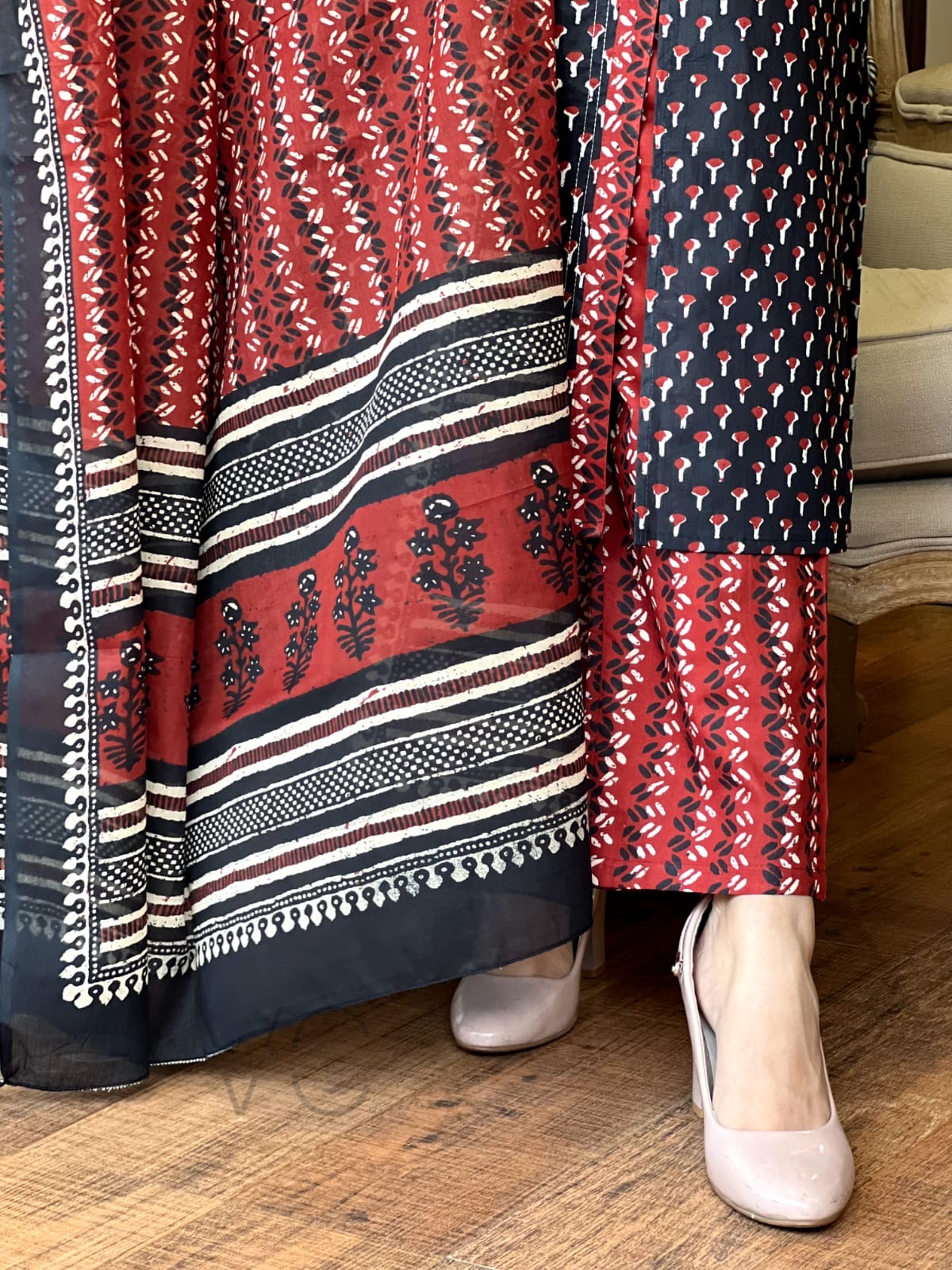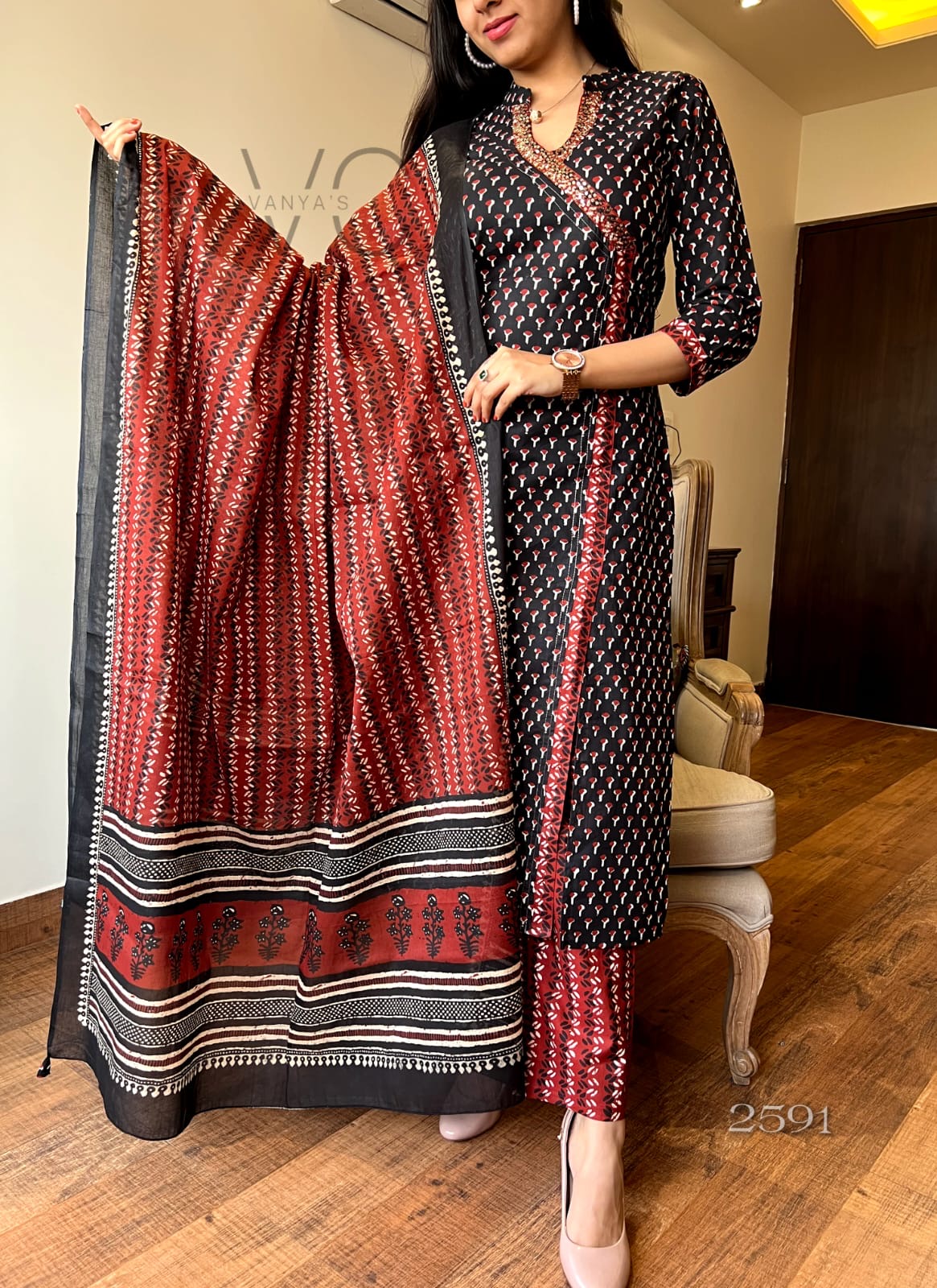 Jaipuri hand block print side slit cut and angrakha style staright kurta m hand block cotton pant and hand block mul duppata.