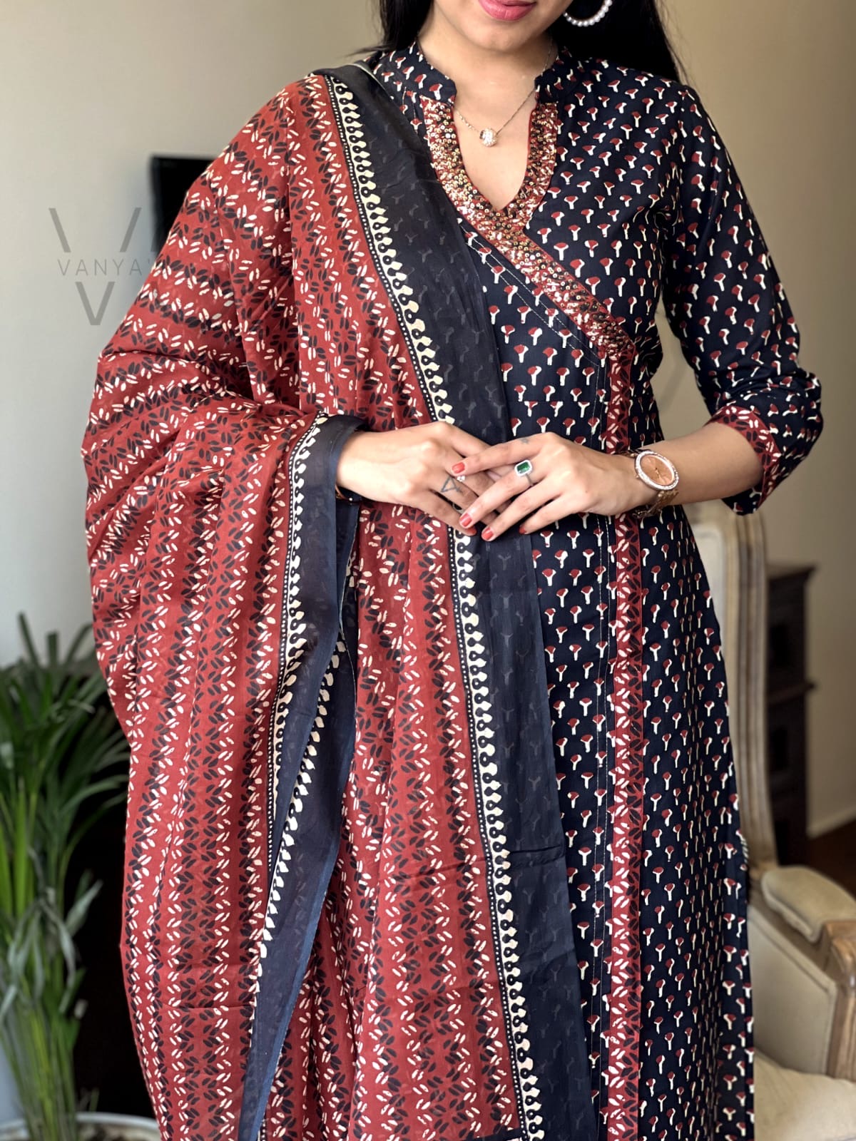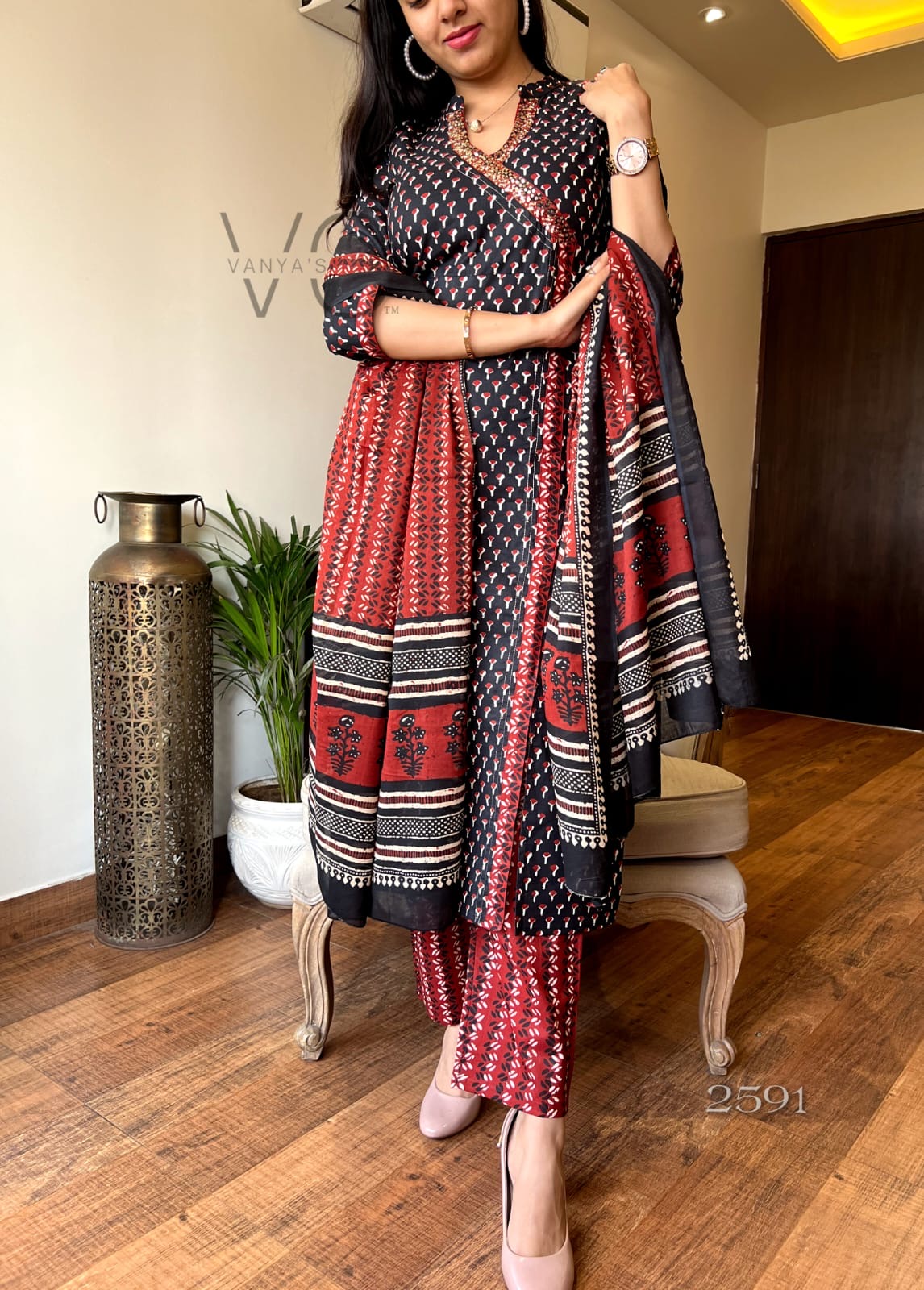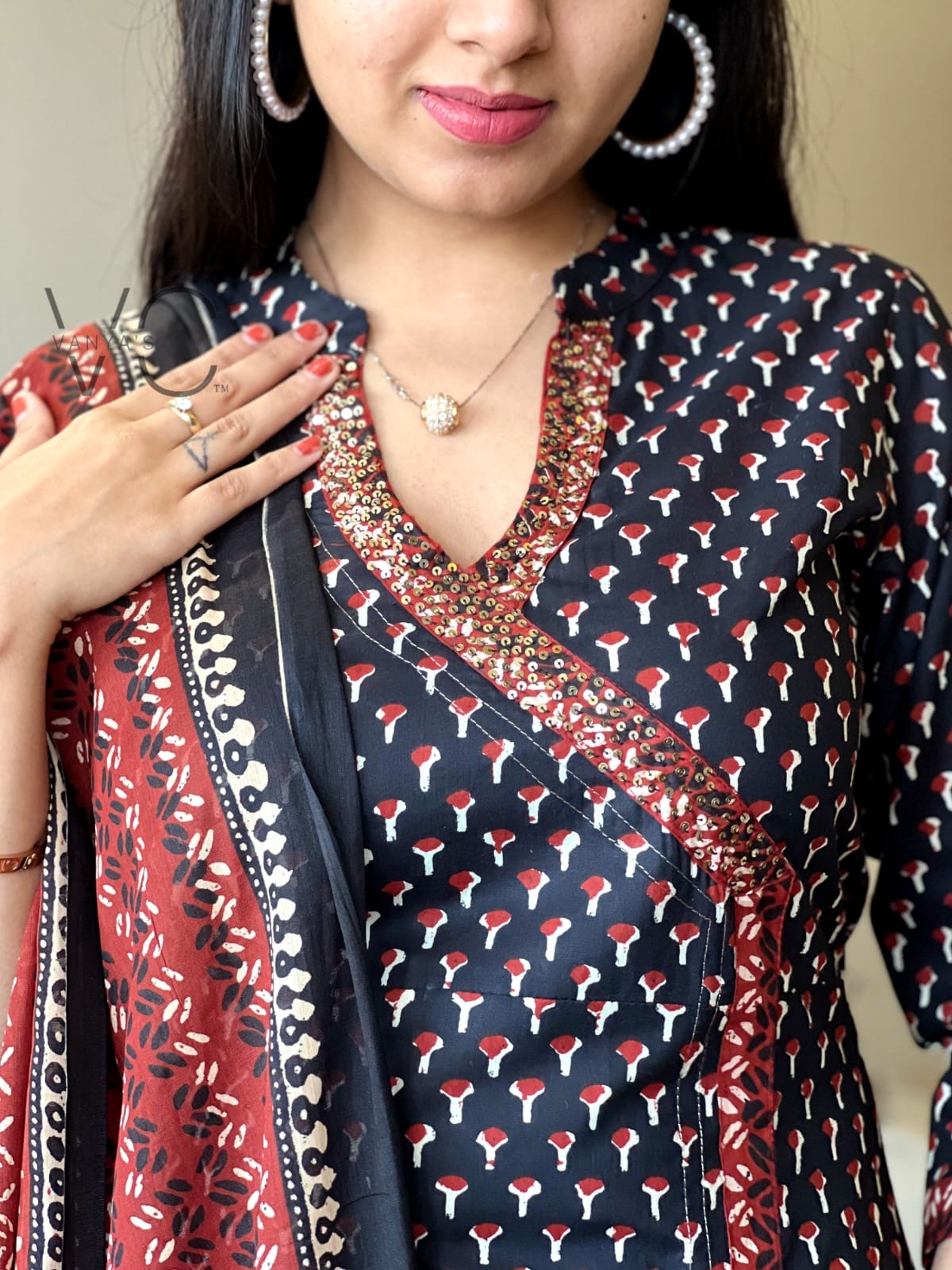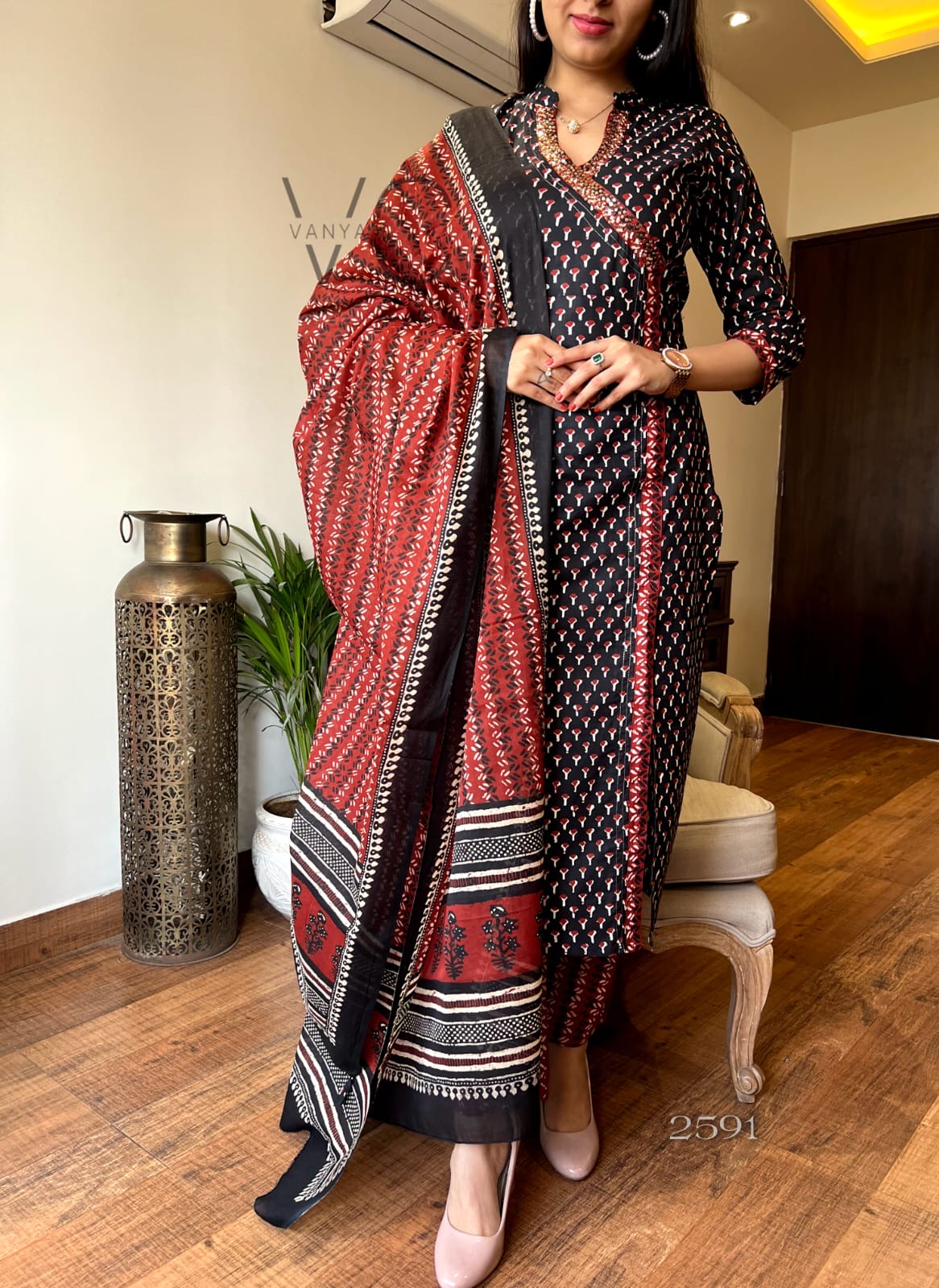 Jaipuri hand block print side slit cut and angrakha style staright kurta m hand block cotton pant and hand block mul duppata.