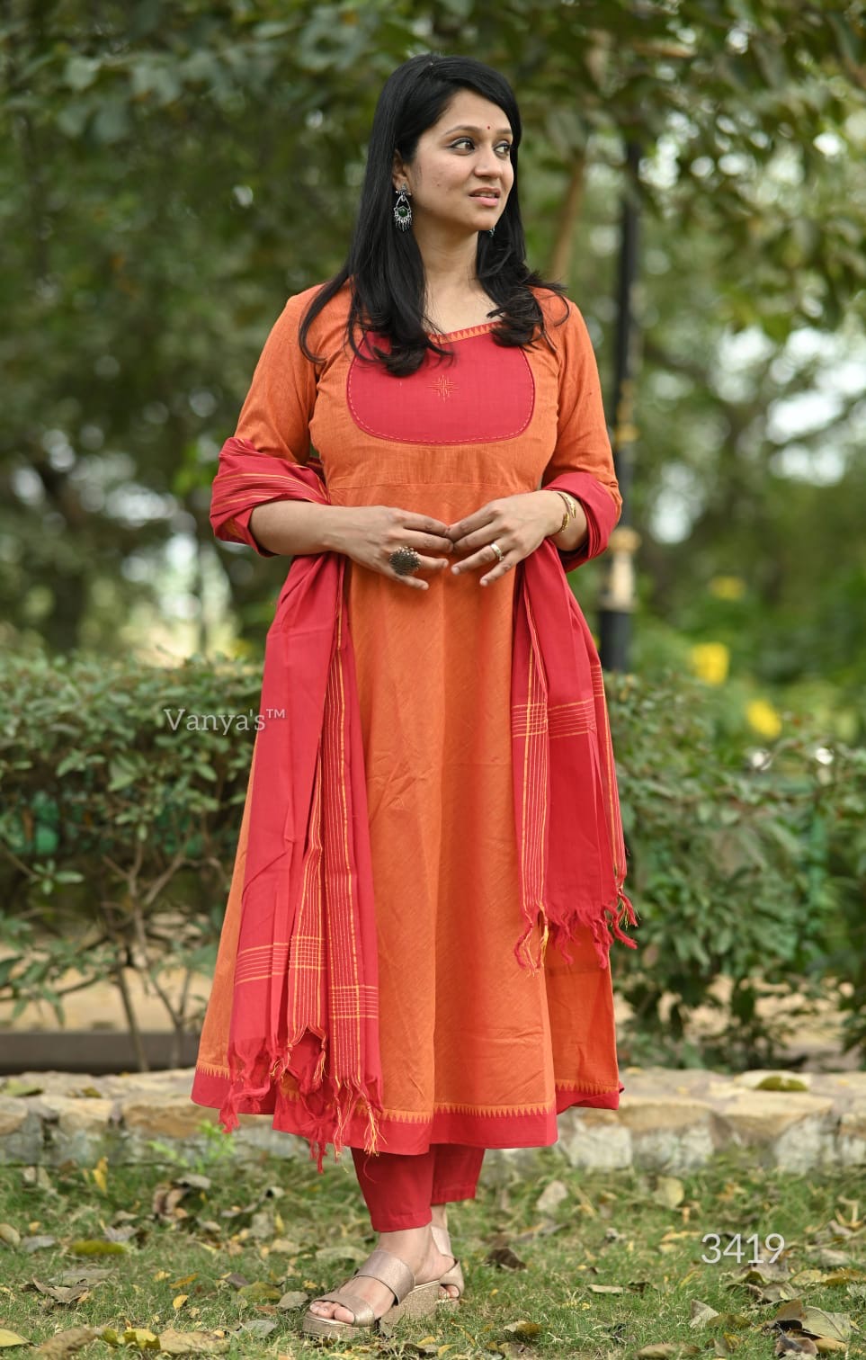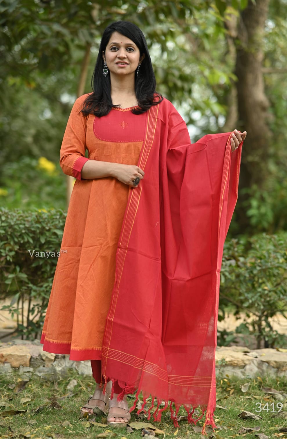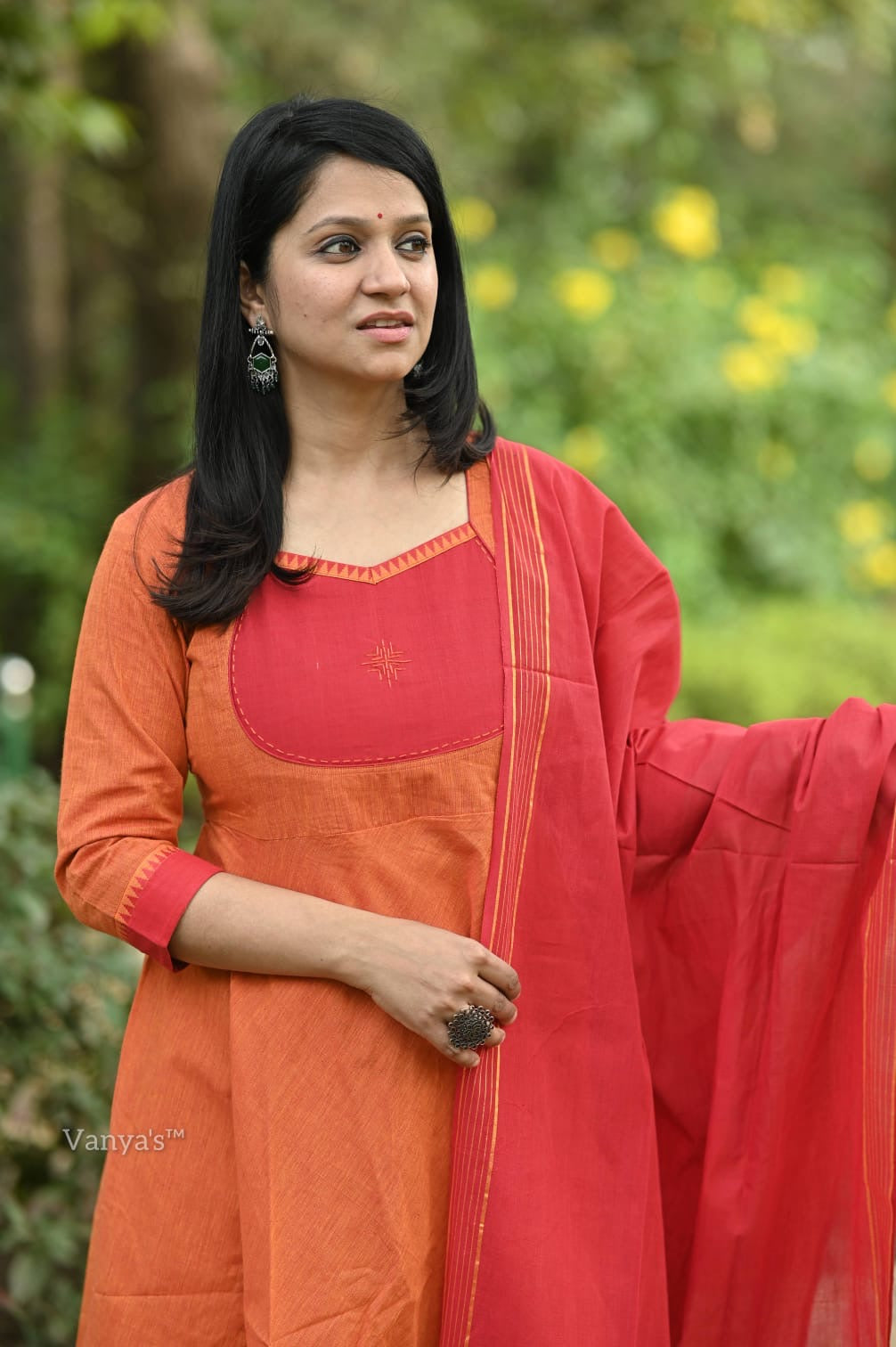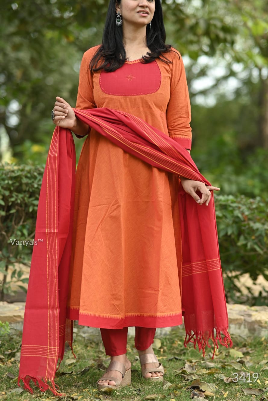 You will be so much in love with this south handloom manglagiri outfit for combinations of temple border self thread handloom butti south cotton anarkali kurta (with attached mul lining till choli) and south cotton pant paired with south cotton duppata self thread self weaving temple border add a unique vibe.