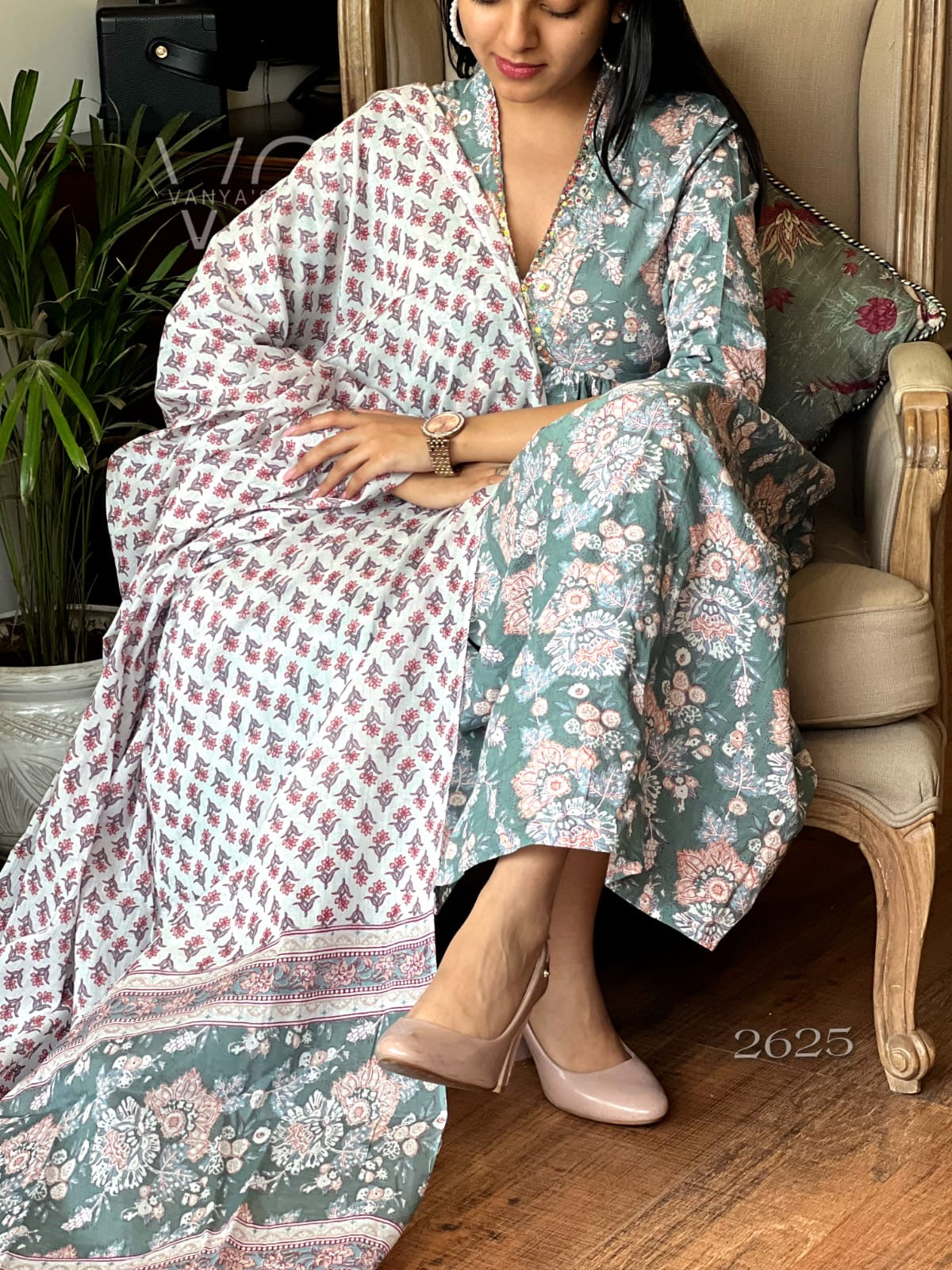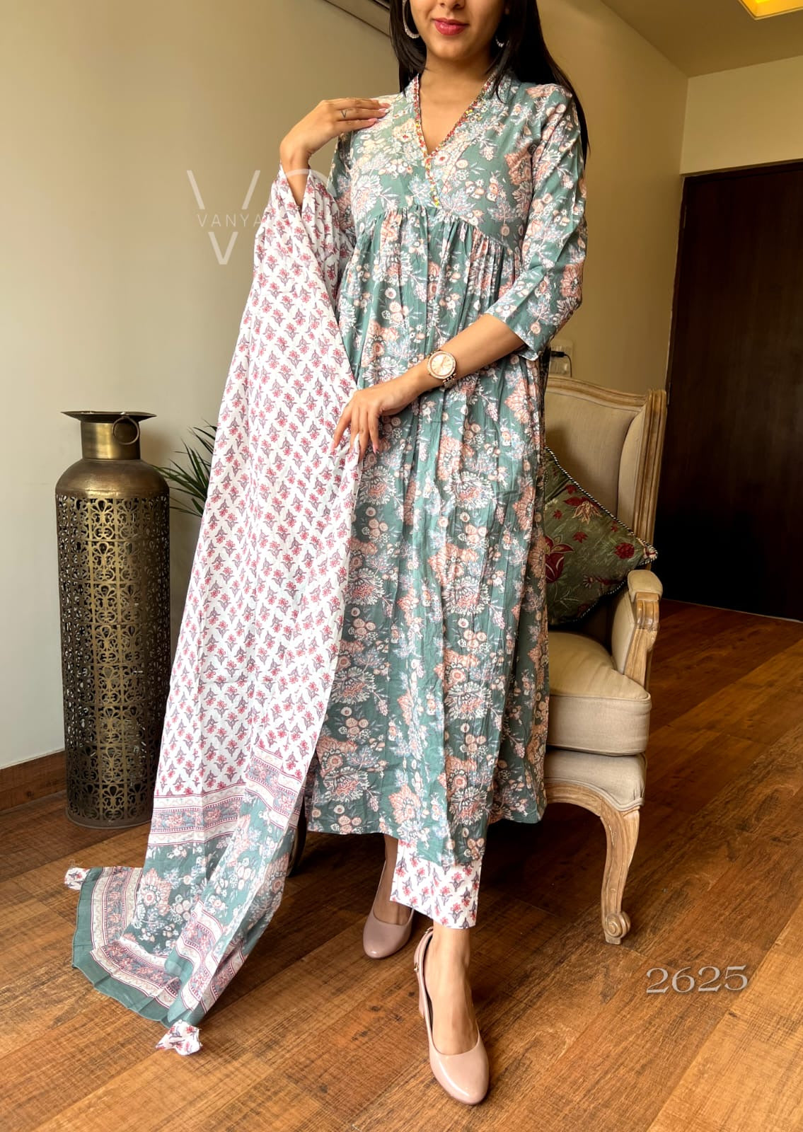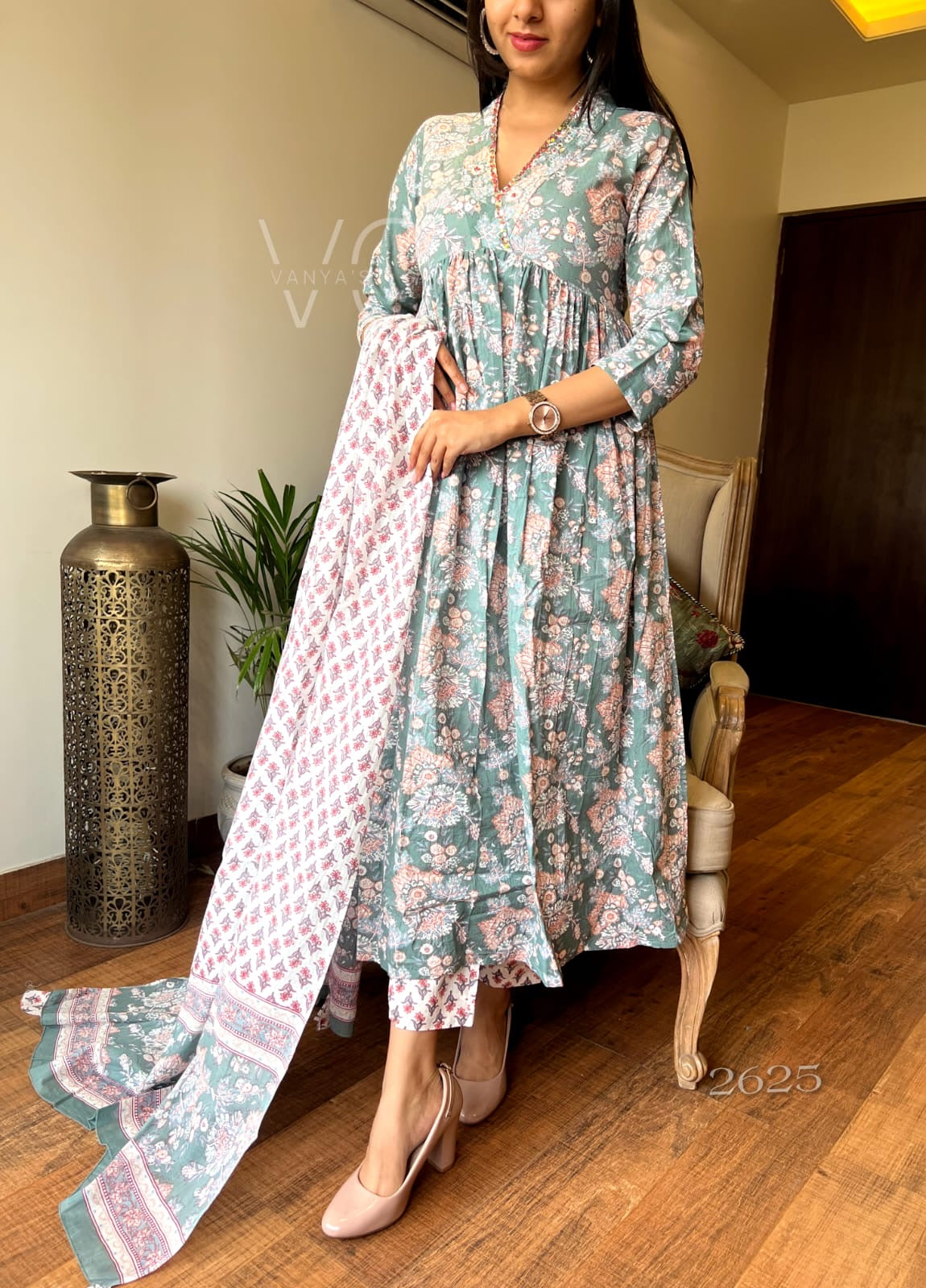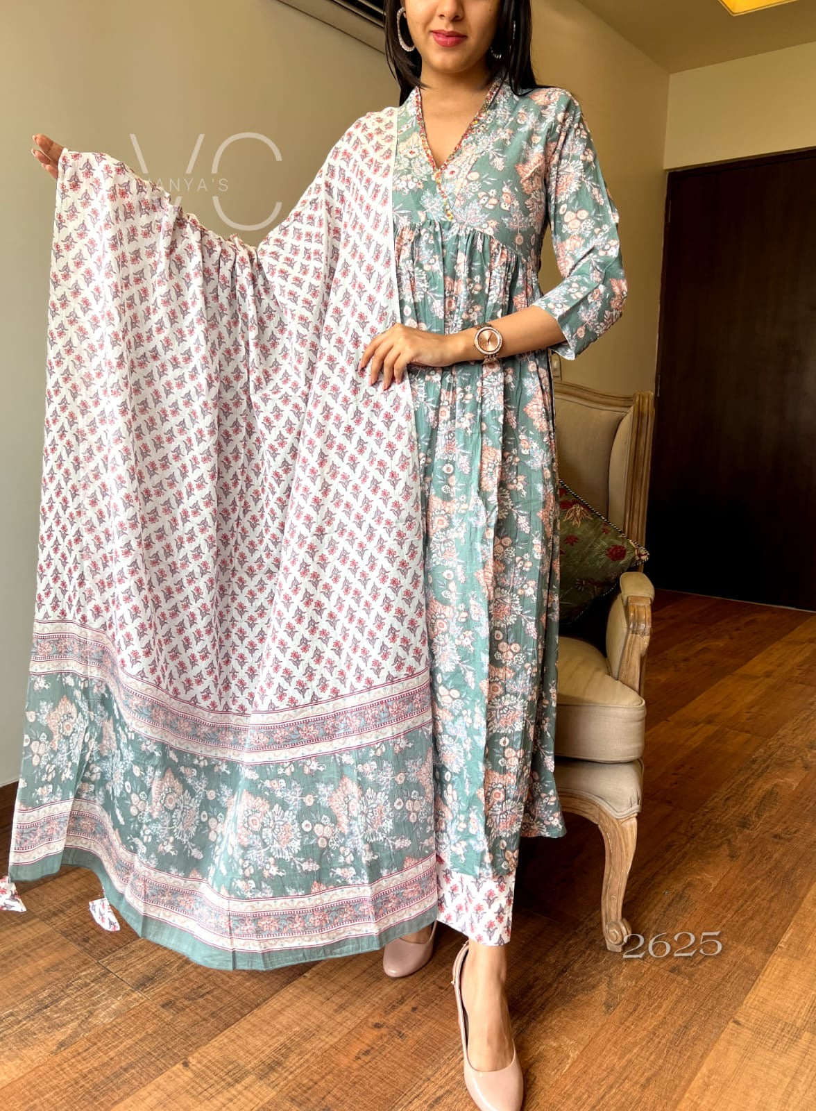 Fabric pure cotton suit print kurta high neck V style , crafted with hand work. Paired with printed pant and mul full size duppata with tassel.