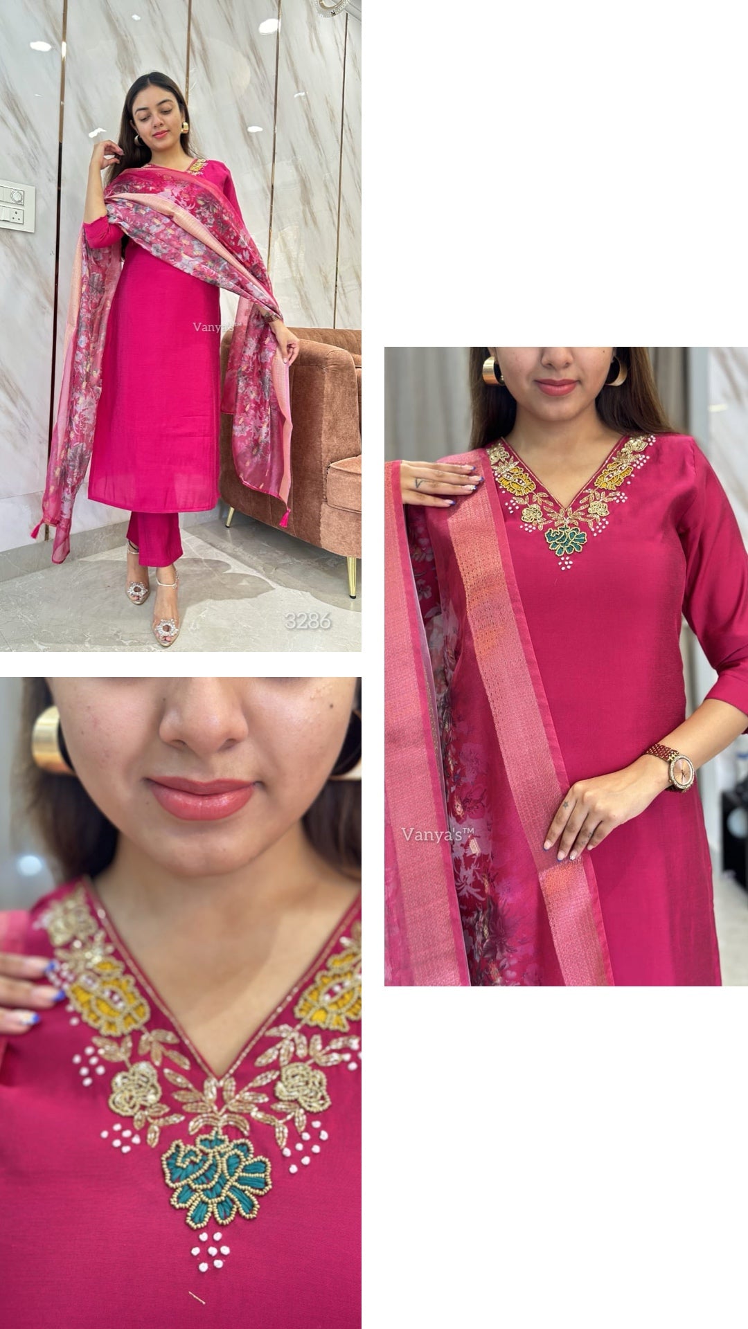 Top in pure roman silk with lining. Style with silk pant and paired with self zari jacquard digital organza duppata.