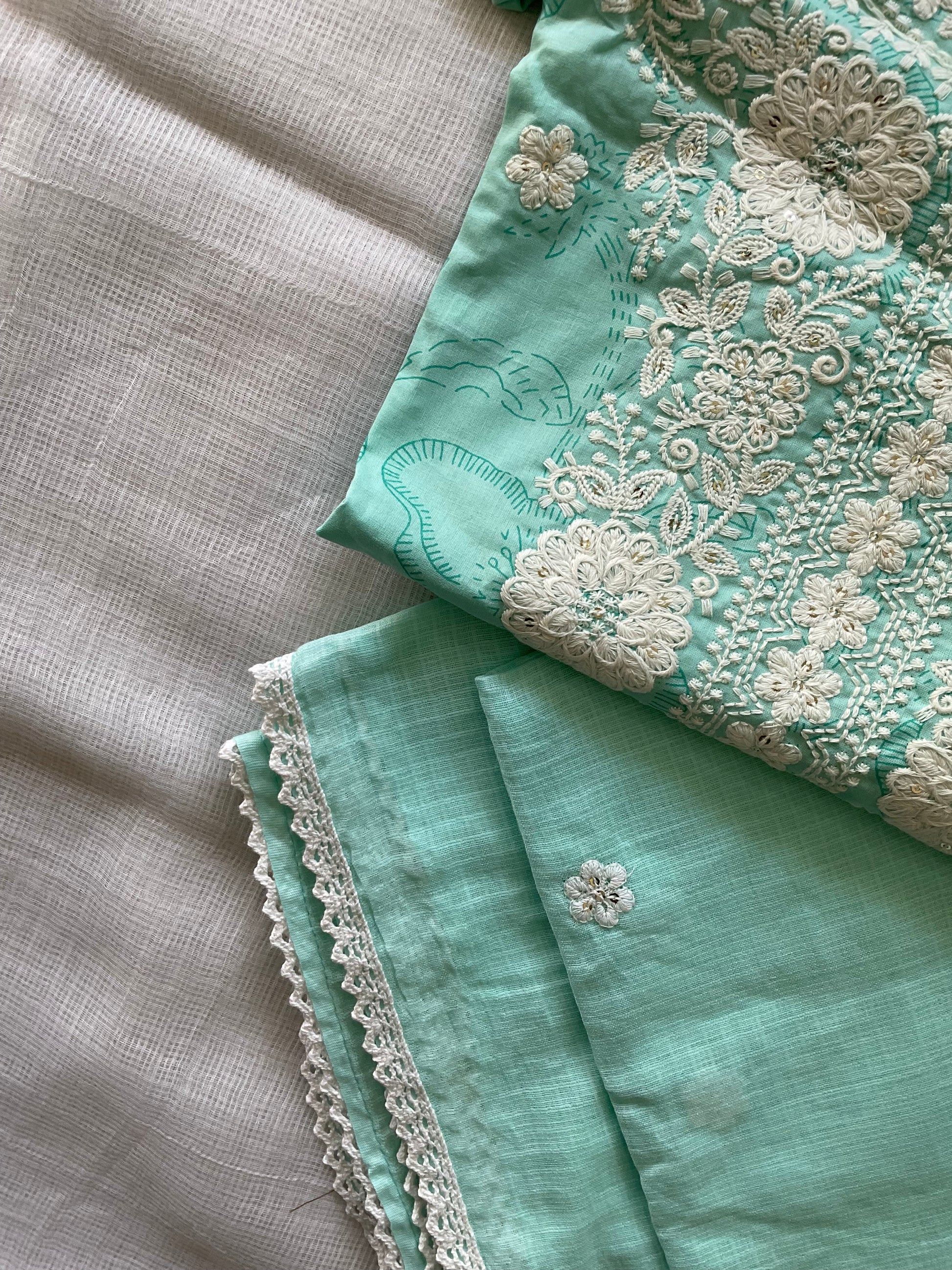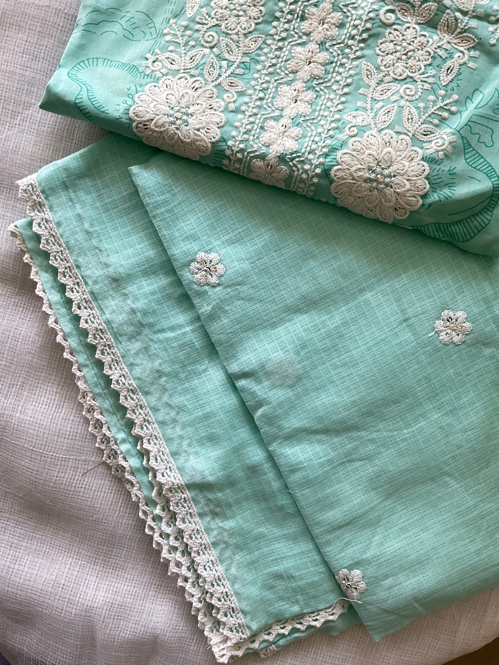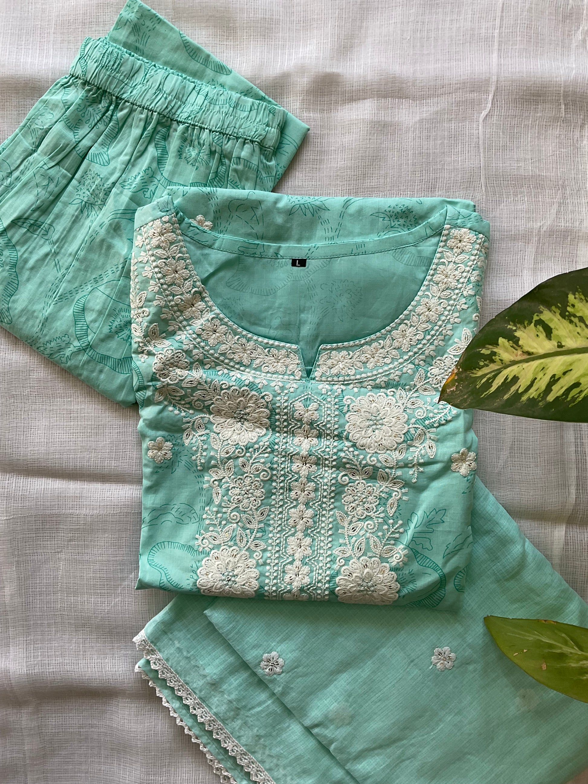 This elegant Cotton Suit Set features a premium cotton kurta with heavythread and sequin work, along with minimalistic hanblock print .To complete the set, it comes with pure cotton pants and a PureKota Doria embroided dupatta with crocia lace work.