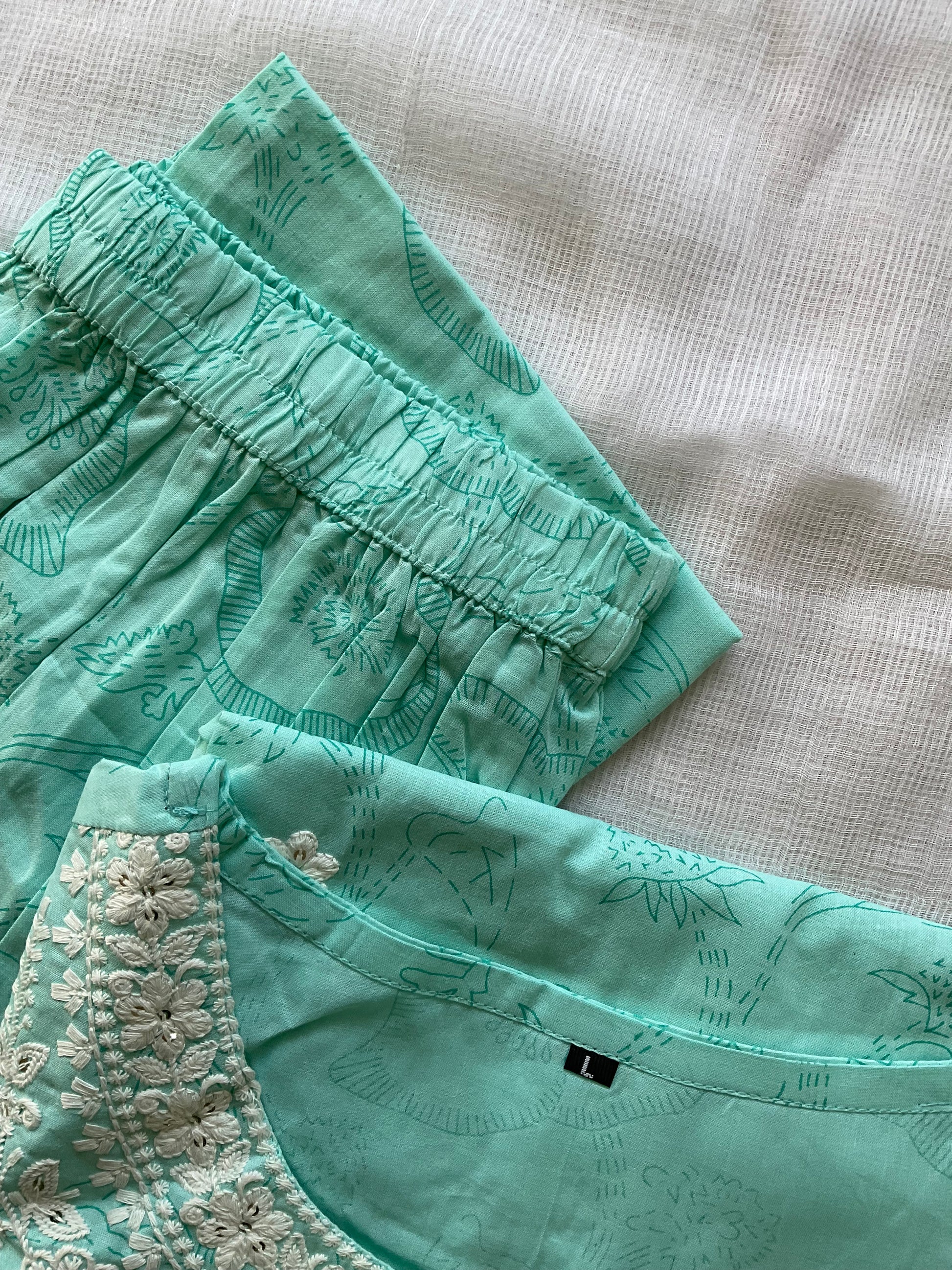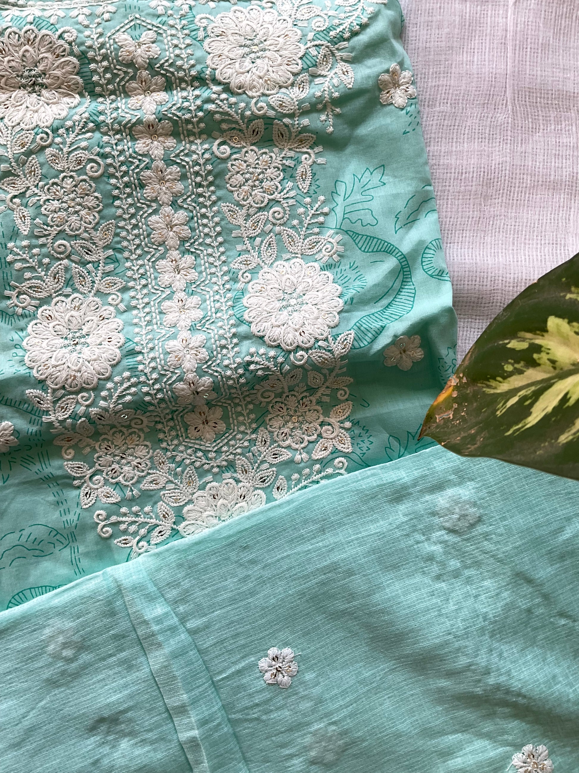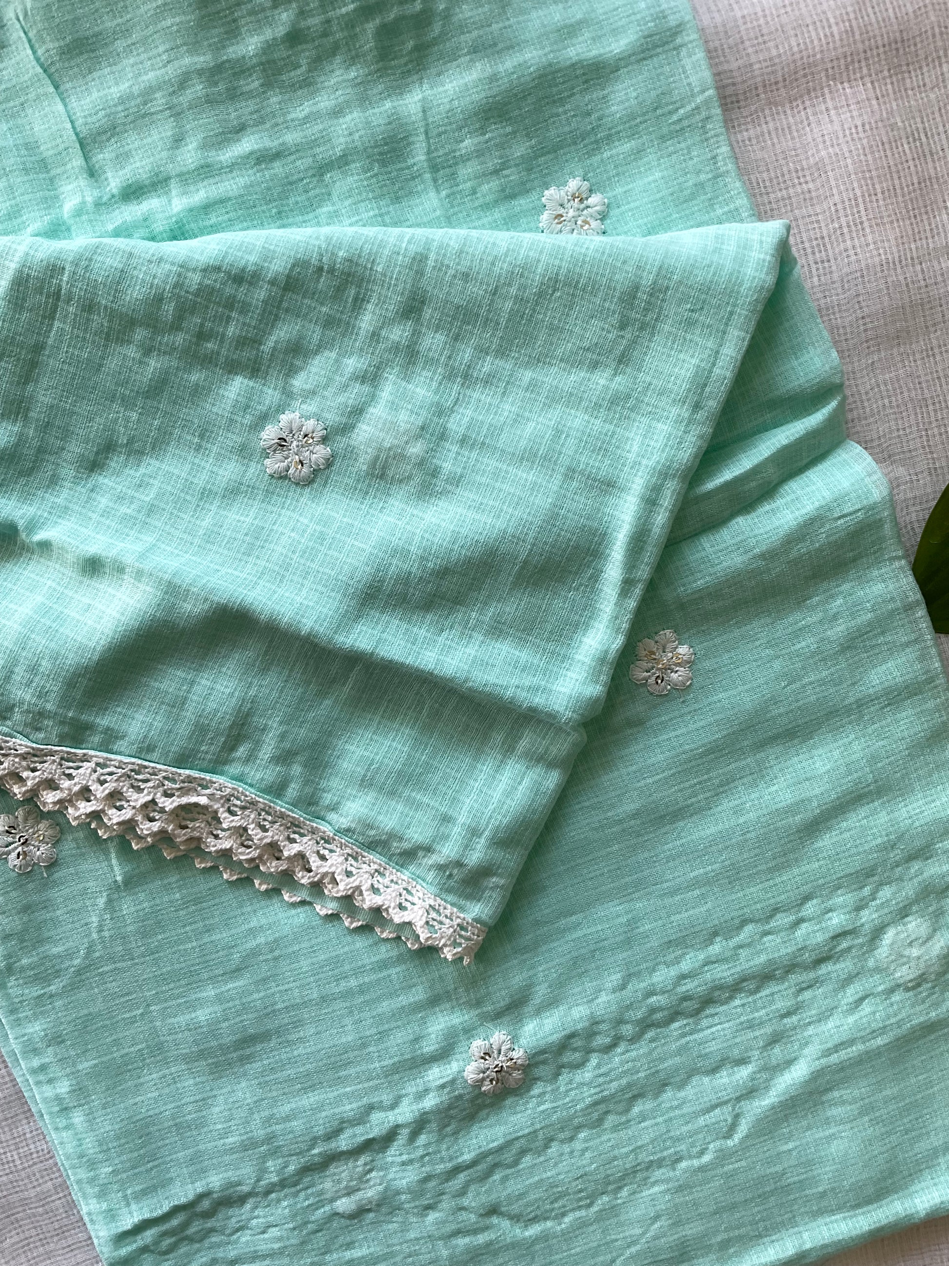 This elegant Cotton Suit Set features a premium cotton kurta with heavythread and sequin work, along with minimalistic hanblock print .To complete the set, it comes with pure cotton pants and a PureKota Doria embroided dupatta with crocia lace work.